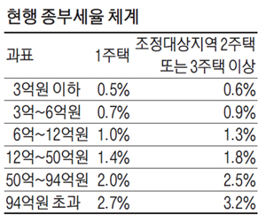 종부세법 개정안은 1주택자와 조정대상지역 외 2주택 보유자에 대한 종부세율은 기존보다 0.1~0.3%포인트 인상하고, 3주택 이상 다주택자나 조정대상지역 2주택 보유자에 대한 세율은 0.2~0.8%포인트 높이는 내용과 조정대상지역 2주택자 종부세 부담 상한을 200%에서 300%로 올리는 내용이 포함돼 있다.