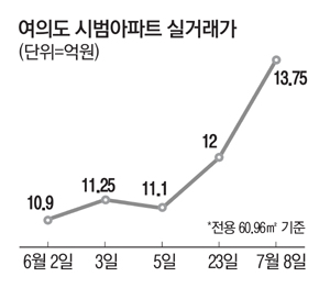 여의도 시범아파트 전용 60㎡ 는 지난달 초만 해도 10억원대 후반에 거래됐지만 이달 8일 13억7500만원, 9일엔 13억6800만원에 잇달아 실거래되면서 한 달 새 시세가 3억원 가까이 올랐다. 여의도 광장아파트 전용 116㎡ 역시 지난달 19억5000만원에 거래되며 신고가를 다시 썼다. 압구정동 한양1차 78㎡ 매물도 지난달 23억원에 실거래되면서 전고가(22억5000만원)를 경신했다.