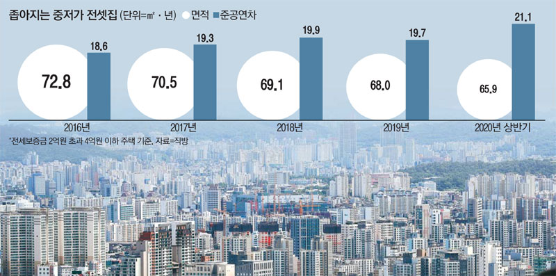 서울 내 중저가 전셋집의 퀄리티가 악화되는 상황에서 집주인들의 이 같은 태도 변화는 서민들의 주거환경 악화를 가속화할 전망이다. 이날 직방이 발표한 자료에 따르면 전셋값이 급등하면서 같은 전세보증금으로 얻을 수 있는 전셋집 면적은 갈수록 축소되고 노후도는 악화되고 있다. 2011년 기준 중저가(보증금 2억원 초과~4억원 이하) 전셋집의 평균 면적은 86㎡였지만 현재는 65.9㎡ 수준으로 좁아졌다. 같은 보증금으로 얻을 수 있는 아파트 연령대(준공연한)는 2011년 13.2년에서 현재 21.1년으로 8년 가까이 늘어났다.