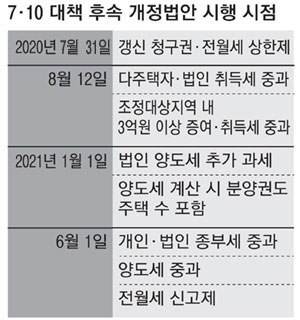 7·10 부동산 대책 후속 개정법안 시행 시기가 제각각으로 분산되면서 시장에서 혼선을 빚고 있다. 기획재정부·행정안전부·국토교통부 등 정부 부처마다 굵직굵직한 개정안을 내놓은 데다 관련 입법 절차가 속도전으로 진행되며 시장이 규제 속도를 못 따라가는 형국이다. 전문가들은 규제 적용 여부에 따라 수천만~수억 원이 왔다 갔다 할 수 있으니 시행 날짜를 잘 확인해둬야 한다고 조언한다. 우선 임대차 3법 가운데 계약갱신청구권제와 전월세상한제는 지난달 31일부터 시행되고 있다. 이제는 기존 계약 갱신에 5%룰이 적용돼 인상률이 제한된다.