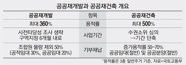 용적률을 최대 500%까지 주는 공공재건축에 대해 재건축 단지 조합 대부분이 시큰둥한 반면, 용적률 최대 360%(3종 일반주거 기준)를 부여하는 공공재개발에는 조합들이 관심을 보이고 있다. 대부분 강북 지역 사업장인 재개발은 인프라스트럭처 개선과 사업 촉진을 할 수 있다면 공공 개입도 마다할 이유가 없는 반면, 강남 지역에 주로 사업장이 있는 재건축은 초과이익환수제에 묶여 있어 공공재건축으로 용적률을 올려줘도 수익이 나지 않기 때문이다.