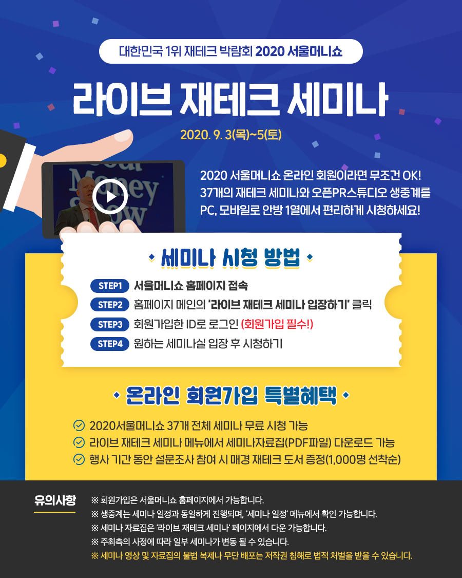 2020서울머니쇼 온라인 회원이라면 라이브 재테크 세미나를 누구나 시청하실 수 있습니다.