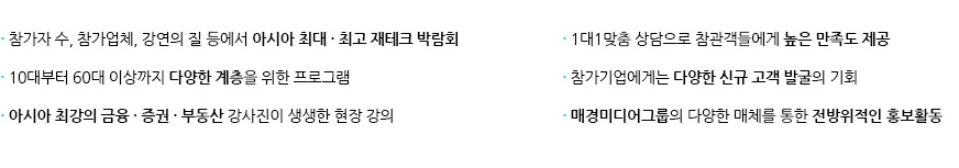 금융, 증권, 부동산, 보험, 은퇴, 투자유치 희망기업, 기타 재테크 관련업체 등 |